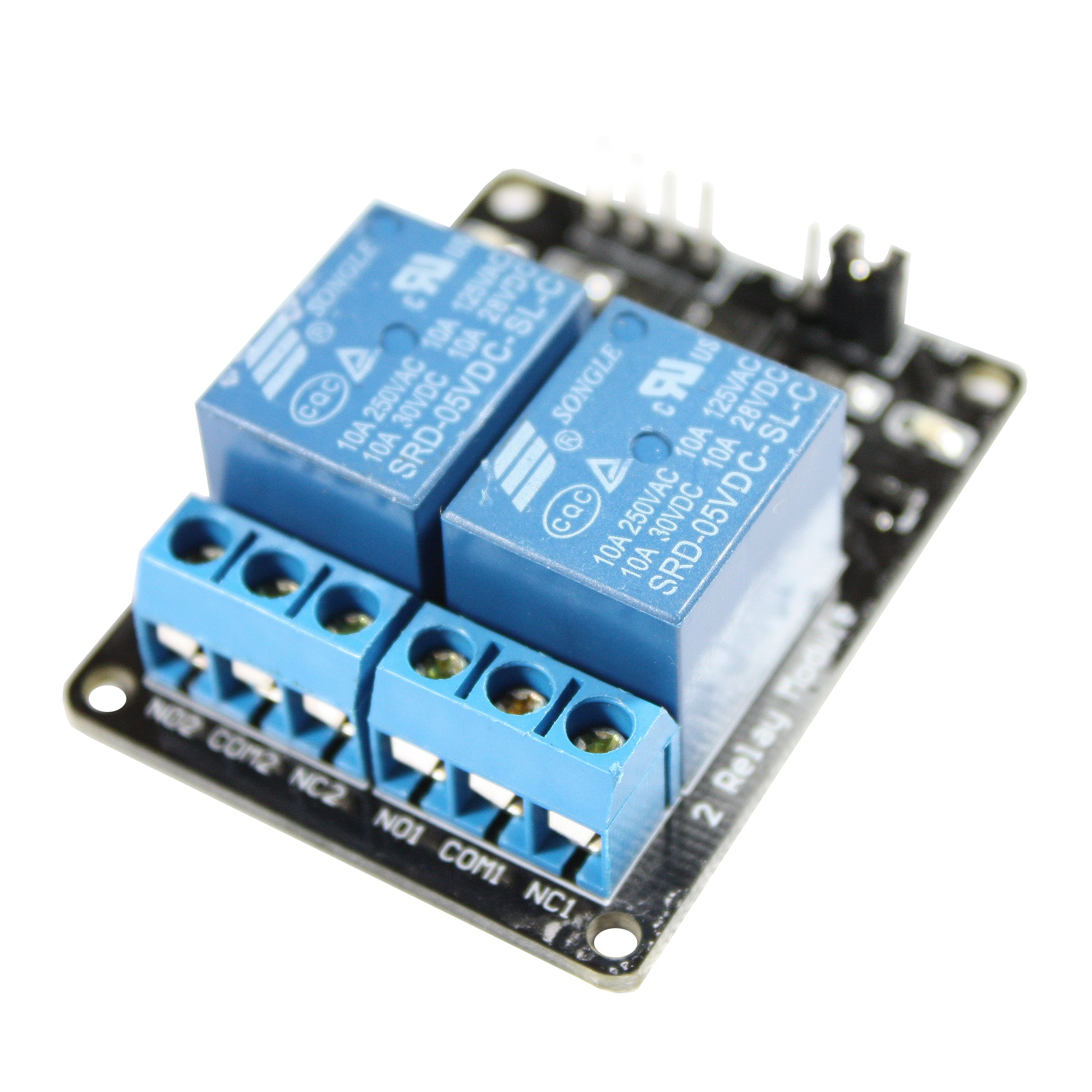 The 2-channel relay module is designed for easy access through microcontrollers, Arduino boards and Raspberry Pis.