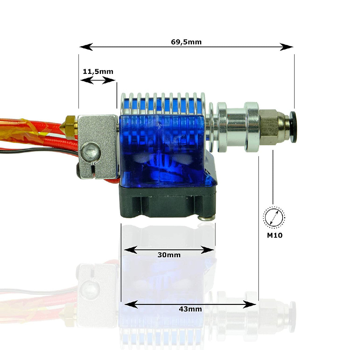 - Nozzle Diameter nozzle 0.4 mm; 100 K thermistor NTC B 3950 setting in Marlin: Temp_Sensor 11; 1 M Teflon tube; Fan 30 * 30 mm 12 V; Cable Length: Heating cartridge and Thermistor 1 m, Fan 27 cm; Allen key to change the heating element and thermistor.
