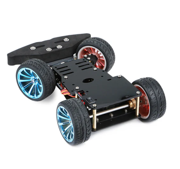 The servo-steered 4WD chassis features a unique steering mechanism distinct from conventional designs. Instead of relying on a left-right differential steering system, it employs a rear-wheel motor drive combined with a front steering mechanism, allowing precise forward, backward, and directional control.