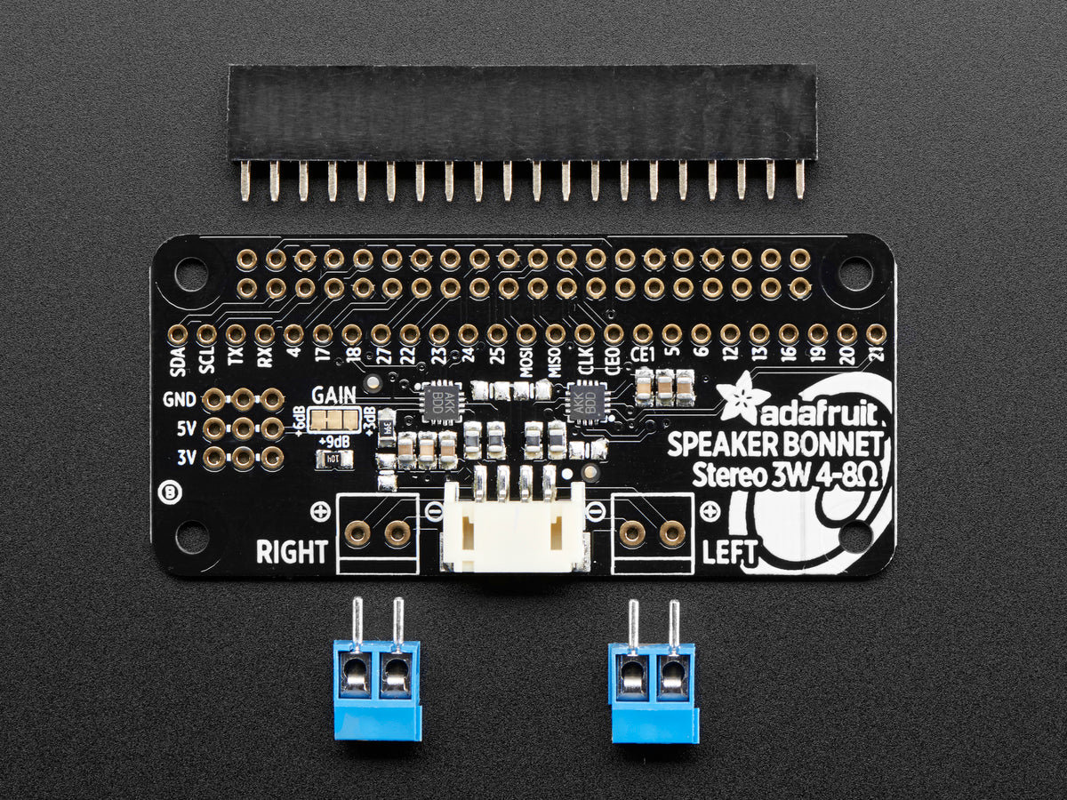 Each order comes as a fully tested PCB with a 2x20 header and 2x terminal blocks. Some light soldering is required to attach the header onto PCB so you can plug it into your Raspberry Pi. Once that's done either plug one of our enclosed speaker sets right into the JST jack in the middle or you can solder the terminal blocks in and then connect any speaker you like like a 4Ω 3W or 8Ω 1W. Hey you can even use a surface transducer!