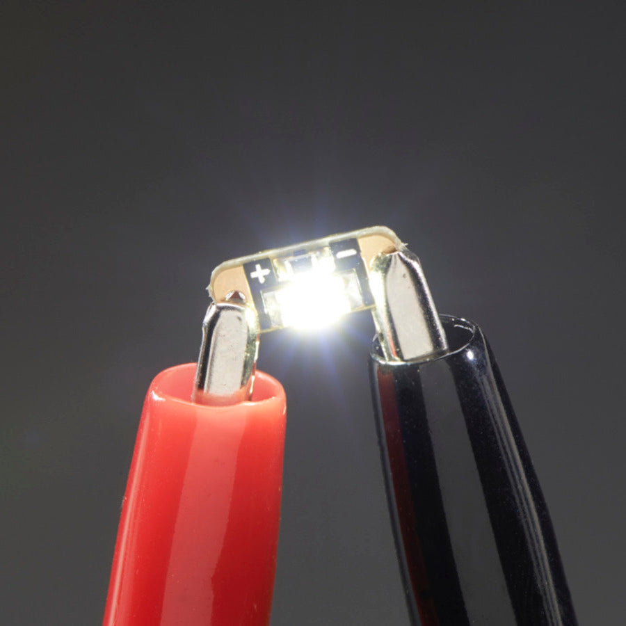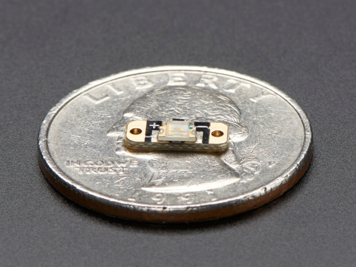 Simply connect 3 to 6VDC to the + pin and ground to the - pin, and the LED on the board will light up. You can make the LEDs fade and twinkle by using the PWM (a.k.a. analogWrite) functionality of your Gemma or Flora, or just connect directly to a digital I/O pin of a microcontroller to turn on and off. Or even skip the micro altogether, and power directly from a LiPoly or coin battery.