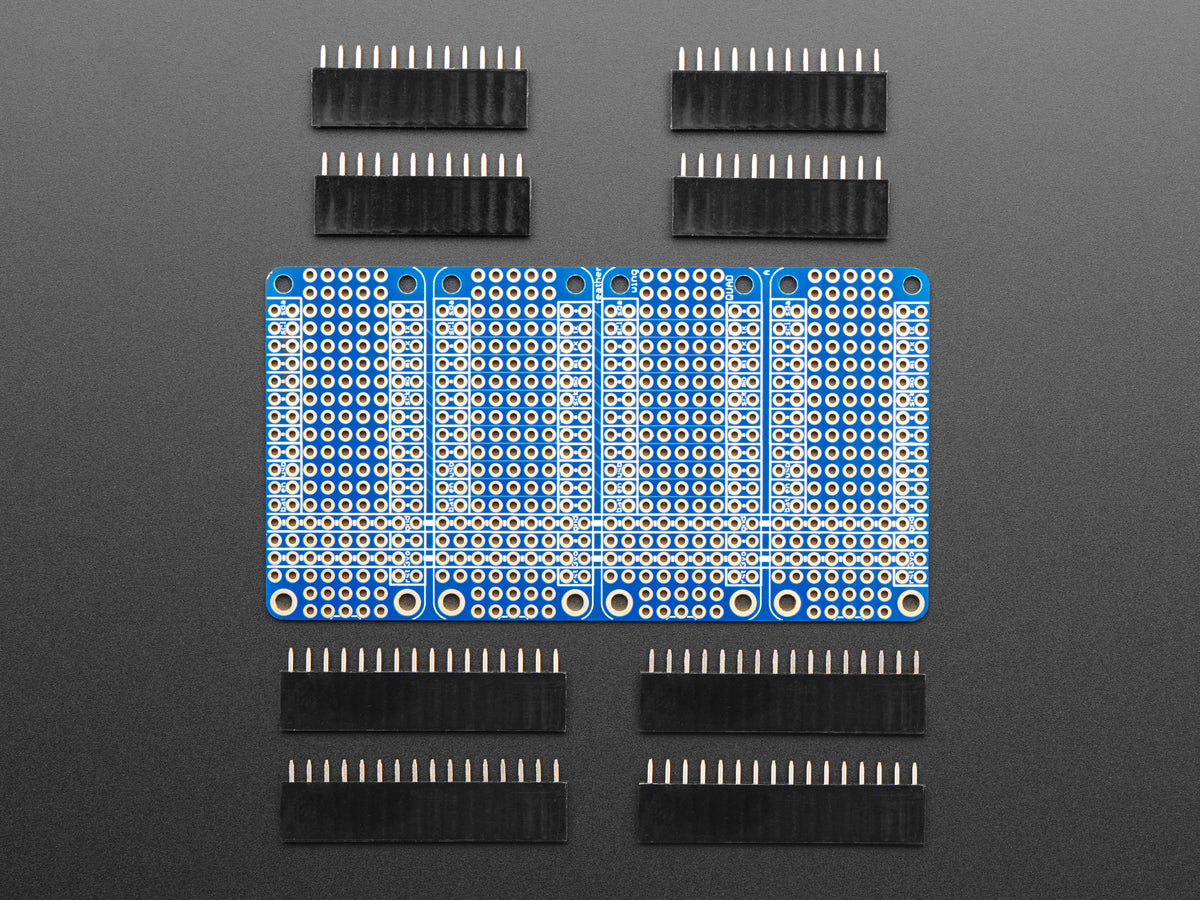 The Quad, like the Proto, has three breakouts for each pin on a Feather, as well as a bunch of plain grid proto holes. Also, the four sets of pins are cross connected and for GND and 3.3V, we give you a full strip of connected pads.