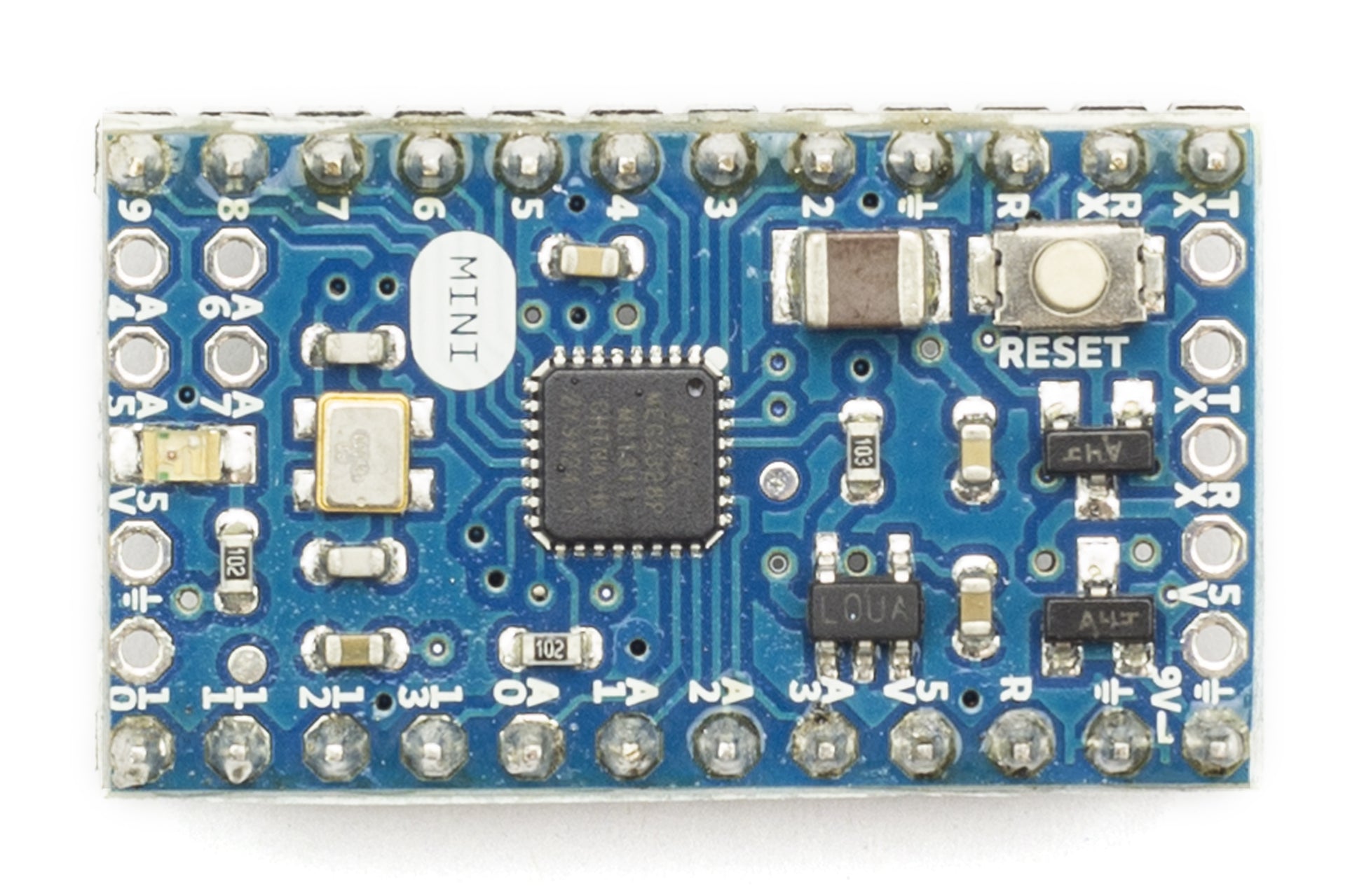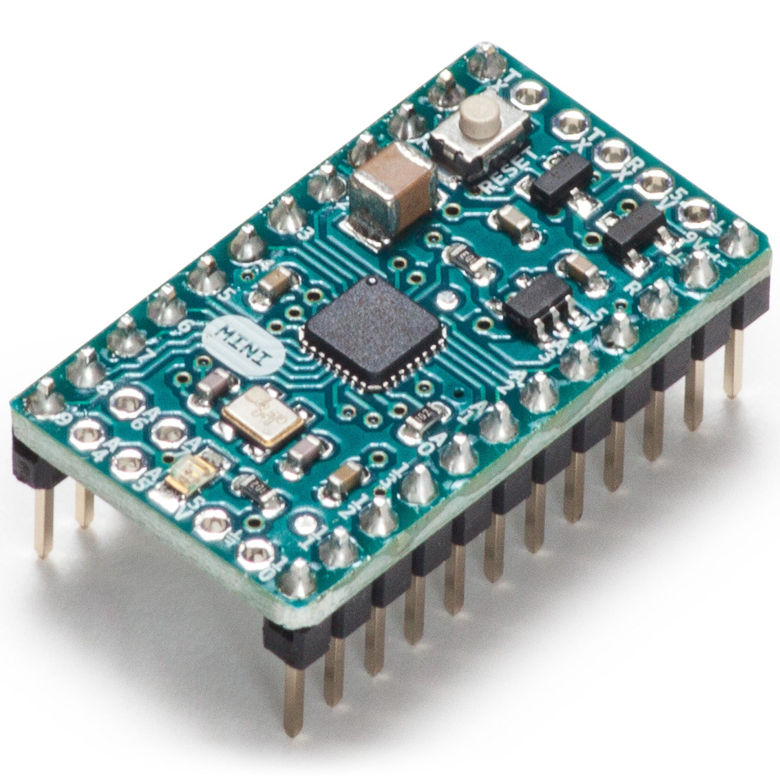 The Arduino Mini 05 is a small microcontroller board originally based on the ATmega168, but now supplied with the 328, intended for use on breadboards and when space is at a premium. It has 14 digital input/output pins (of which 6 can be used as PWM outputs), 8 analog inputs, and a 16 MHz crystal oscillator. It can be programmed with the USB Serial adapter or other USB or RS232 to TTL serial adapter.