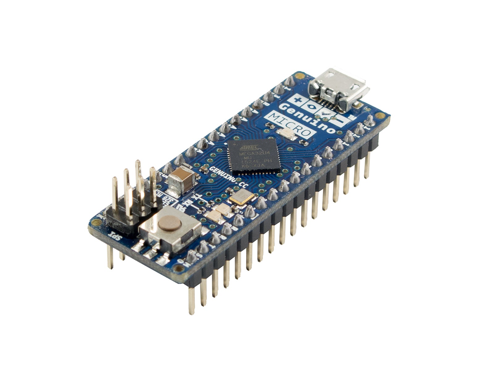 Genuino Micro is a microcontroller board based on the ATmega32u4, developed in conjunction with Adafruit. It has 20 digital input/output pins (of which 7 can be used as PWM outputs and 12 as analog inputs), a 16 MHz crystal oscillator, a micro USB connection, an ICSP header and a reset button. It contains everything needed to support the microcontroller; simply connect it to a computer with a micro USB cable to get started. It has a form factor that enables it to be easily placed on a breadboard.