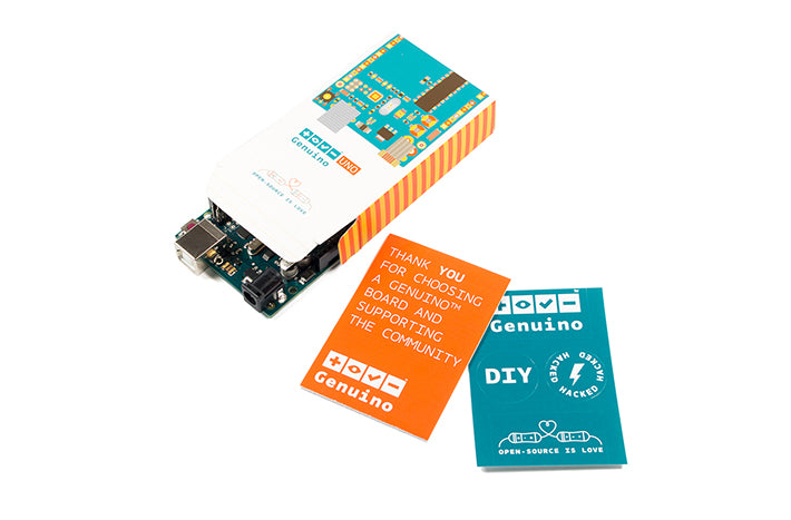 The Genuino UNO R3 is a microcontroller board based on the ATmega328. It has 14 digital input/output pins (of which 6 can be used as PWM outputs), 6 analog inputs, a 16 MHz crystal oscillator, a USB connection, a power jack, an ICSP header, and a reset button. It contains everything needed to support the microcontroller; simply connect it to a computer with a USB cable (not included) or power it with a AC-to-DC adapter or battery to get started. The UNO differs from all preceding boards because it does not use the FTDI USB-to-serial driver chip.