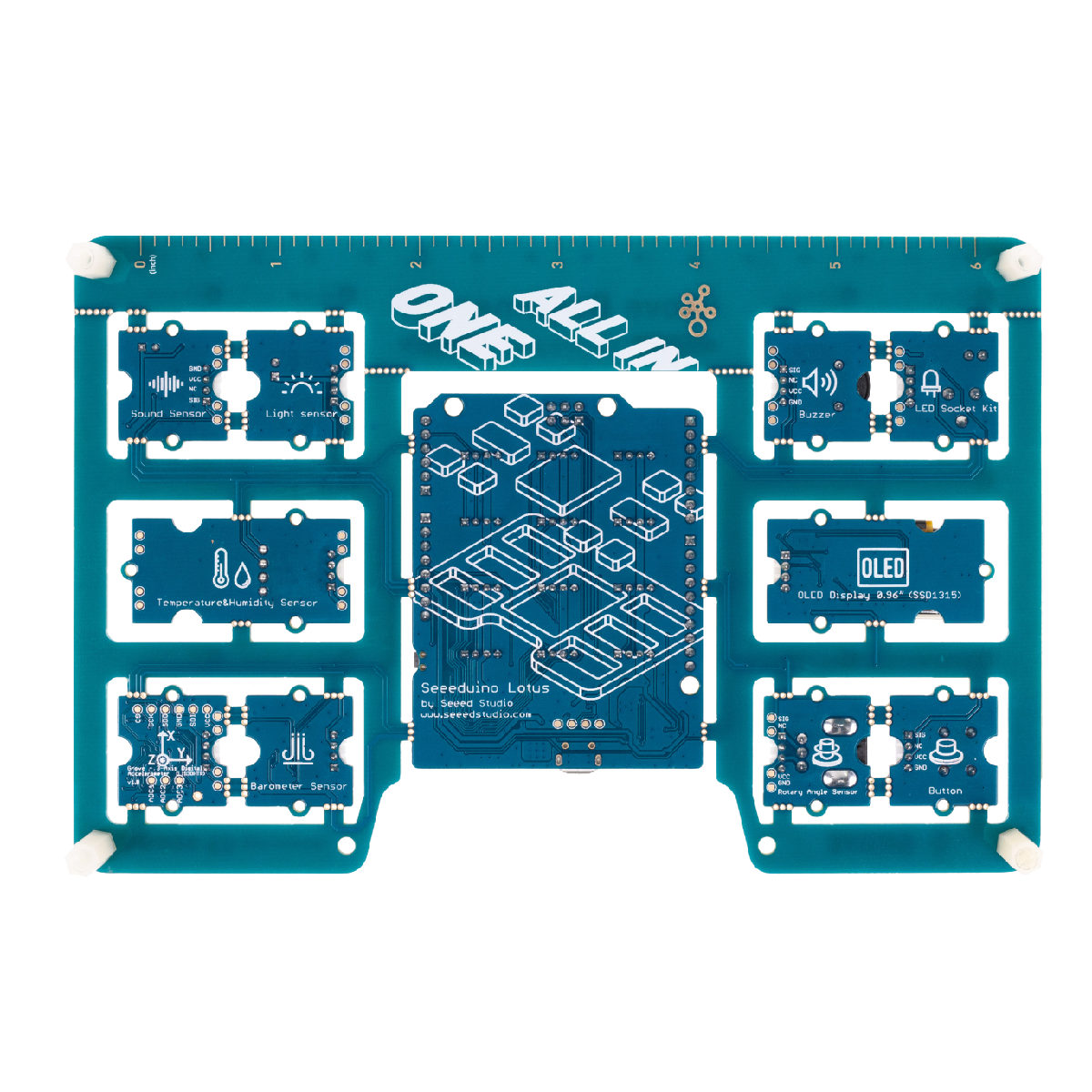 All the modules have been connected to the Seeeduino(Microcontroller) through the PCB stamp holes so no Grove cables are needed to connect. This is perfect for educational fields where frustrating wiring and soldering is no longer needed.